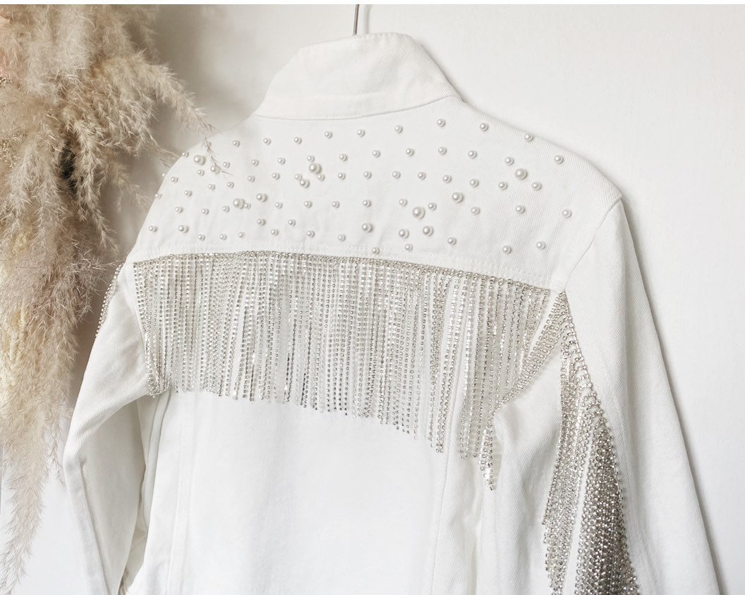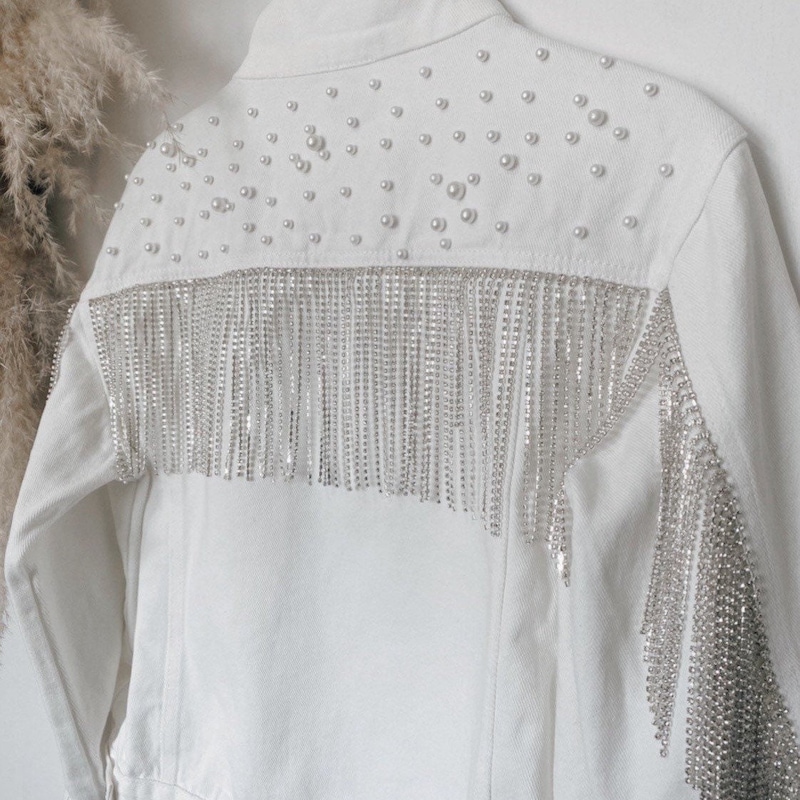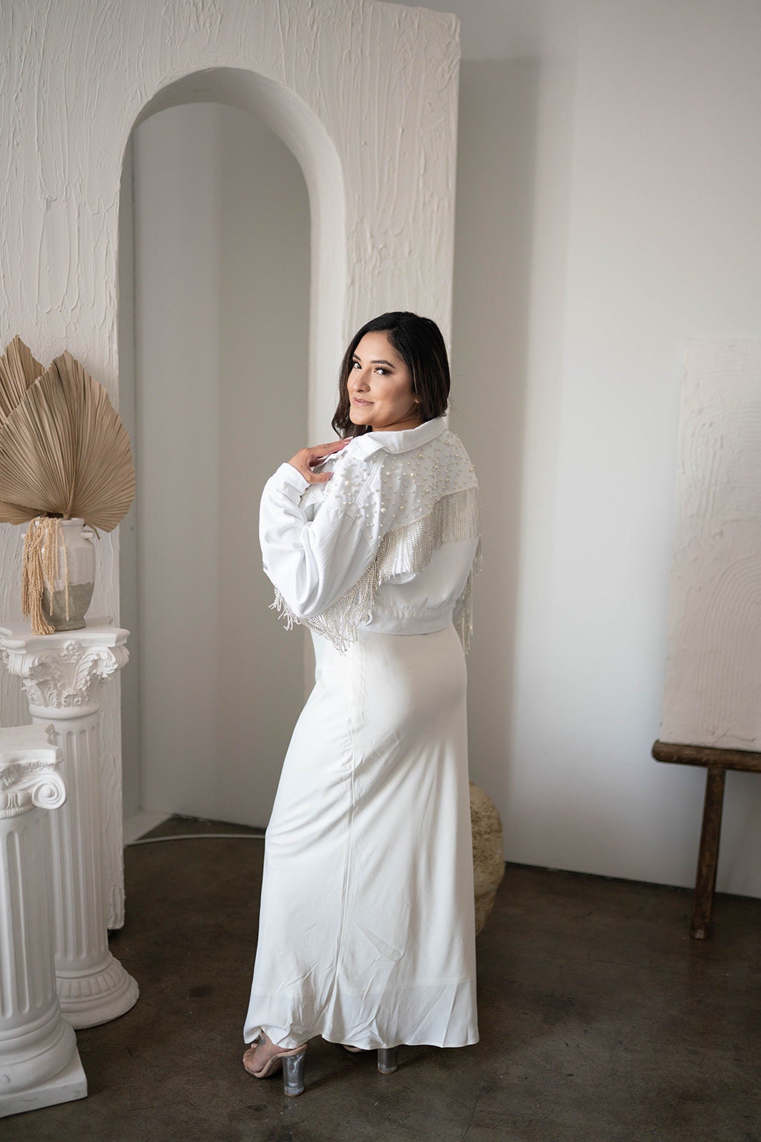 Beautiful Custom Pearl Jacket perfect for any bride or bridesmaid. This jacket is beautifully embellished with pearls and can be customized to say any phrase you desire. This jacket can be gifted to a bride for her honeymoon, wedding day, engagement shoot, or bachelorette party.