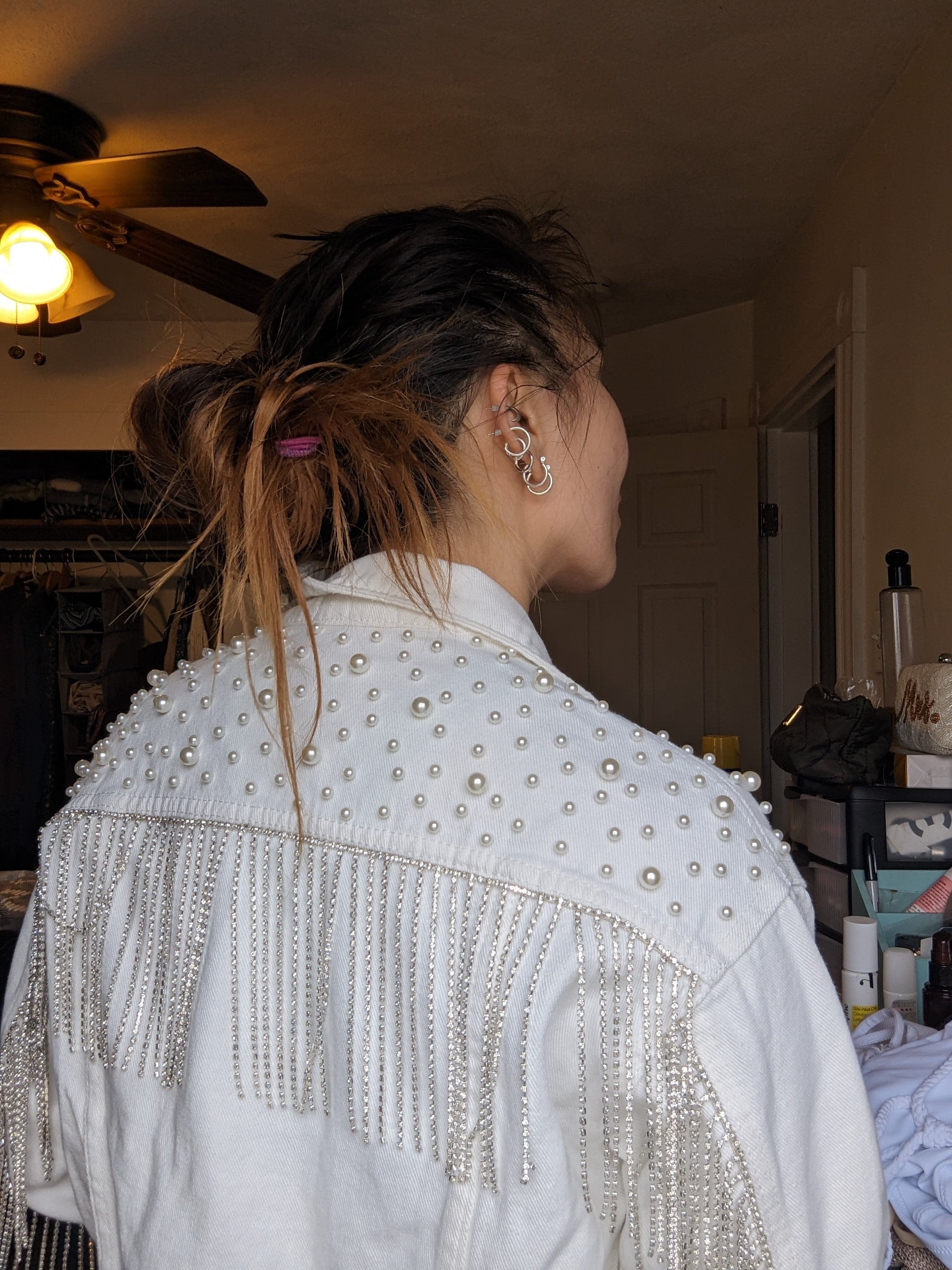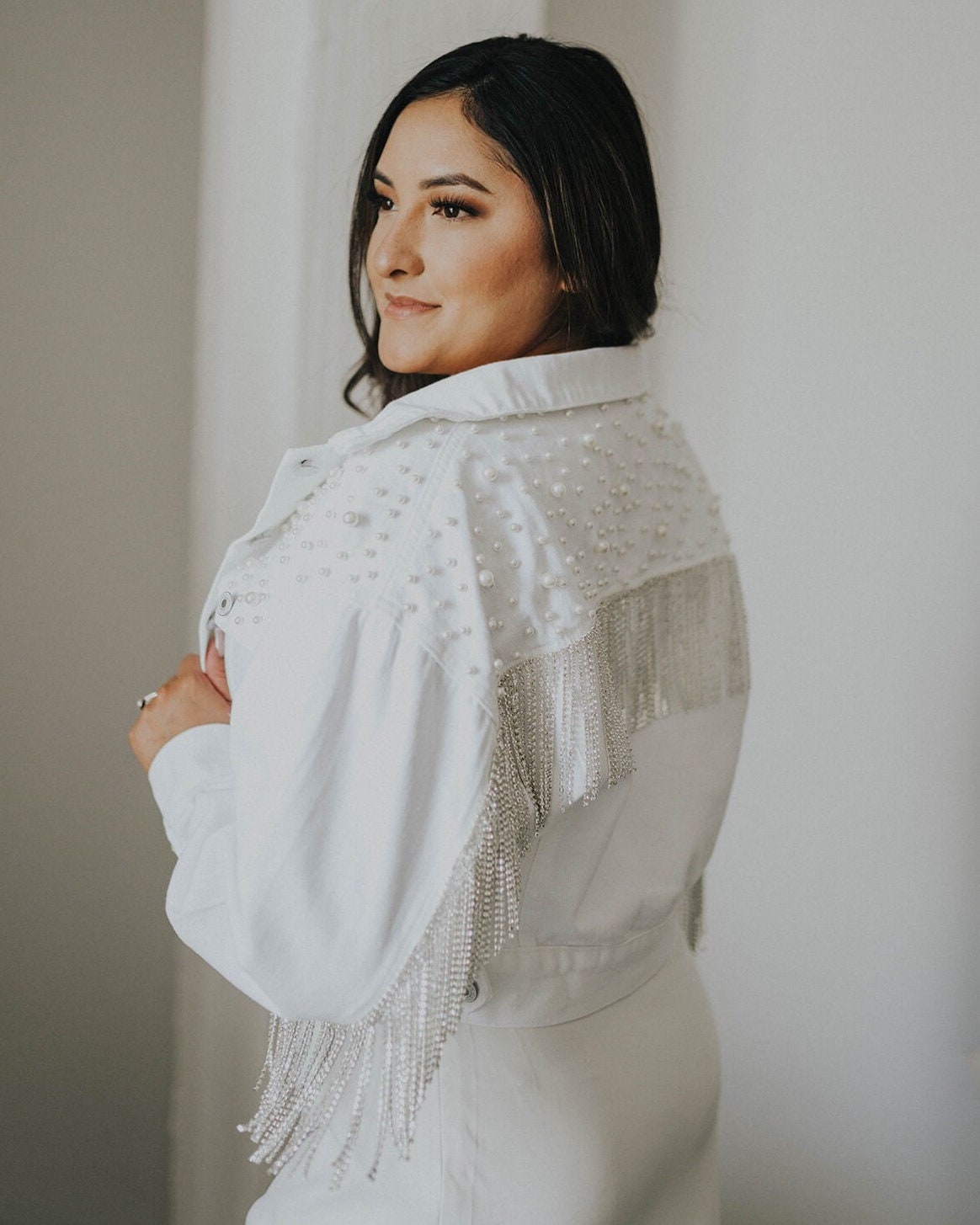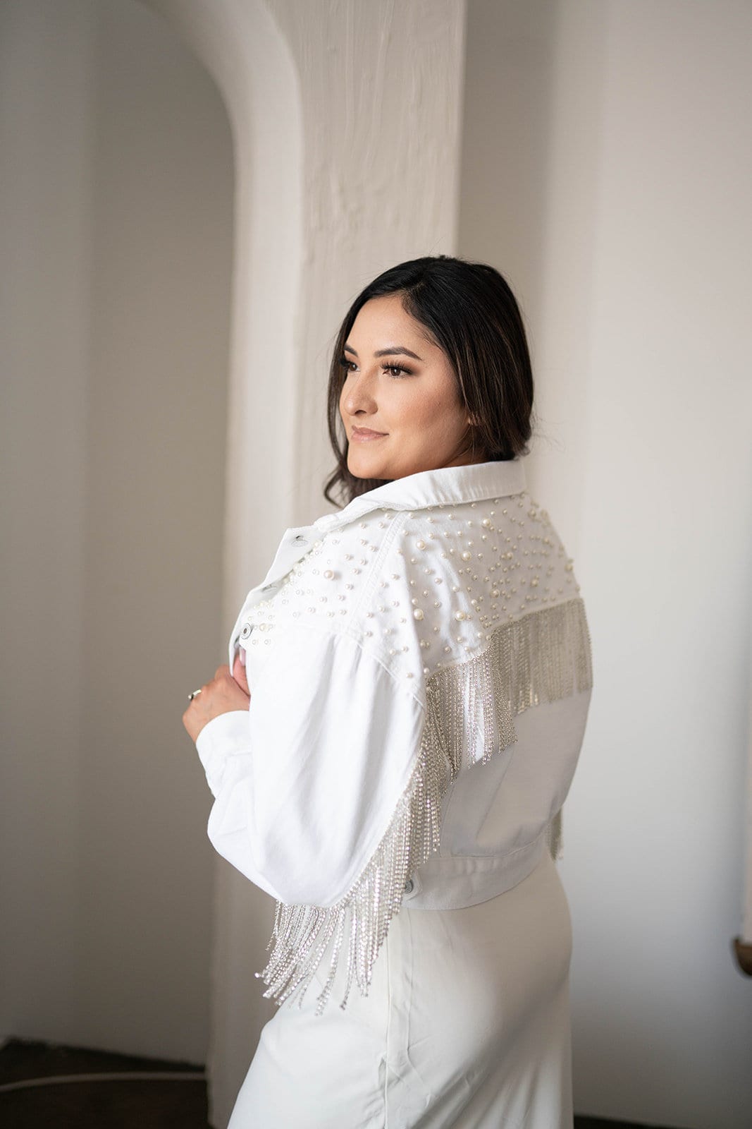 Beautiful Custom Pearl Jacket perfect for any bride or bridesmaid. This jacket is beautifully embellished with pearls and can be customized to say any phrase you desire. This jacket can be gifted to a bride for her honeymoon, wedding day, engagement shoot, or bachelorette party.